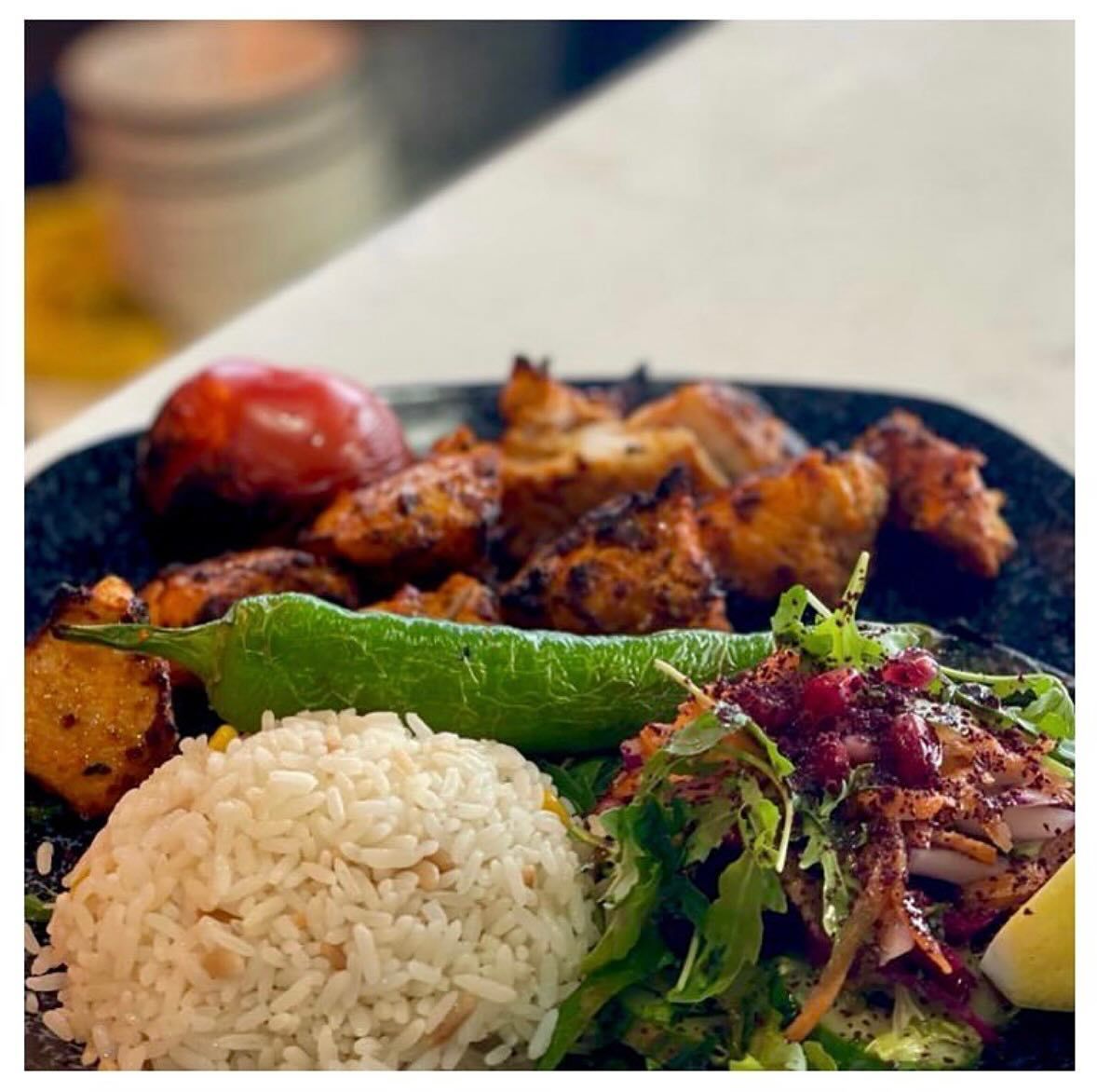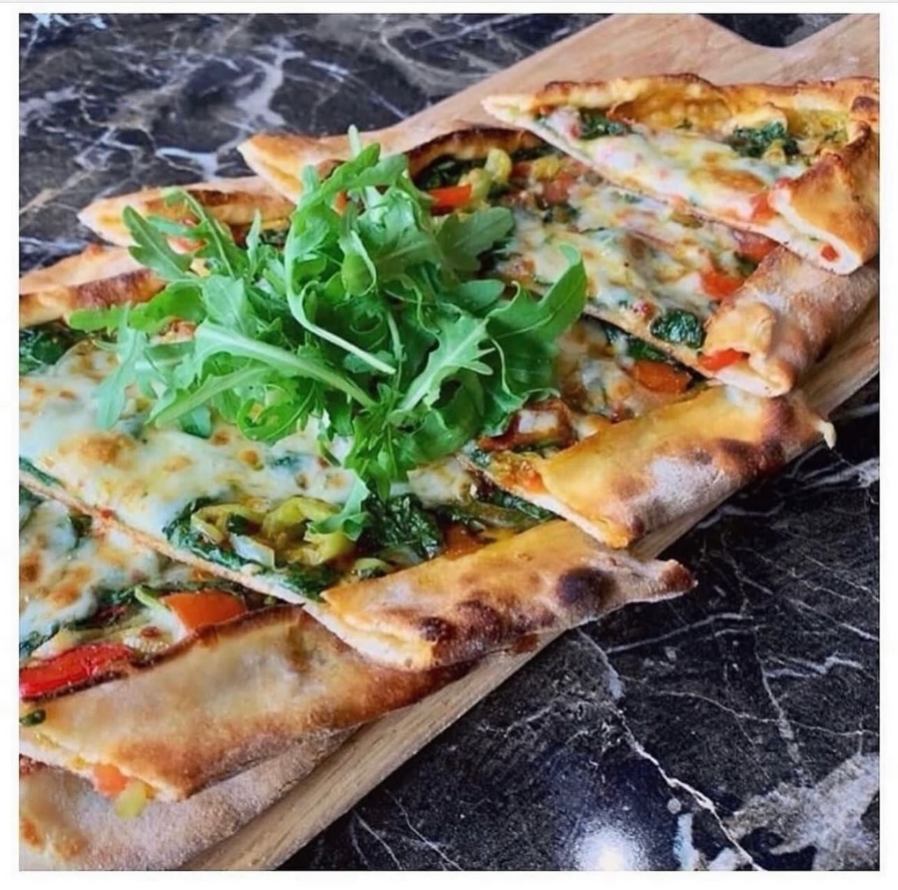 Freshly baked Turkish pizza with mozzarella, mushrooms & baby spinach